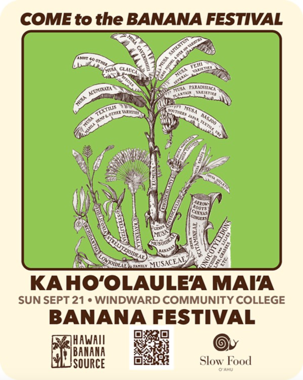 Bring your friends & 'ohana for a day of tasty treats, plants and education. Hosted by Hawaii Banana Source and Slow Food in Hawaii at Windward Community College in Kane'ohe. The festival is Sunday, Sept 21 from 10 AM-2:30 PM. Get ready to celebrate the 'aina and all things banana!
